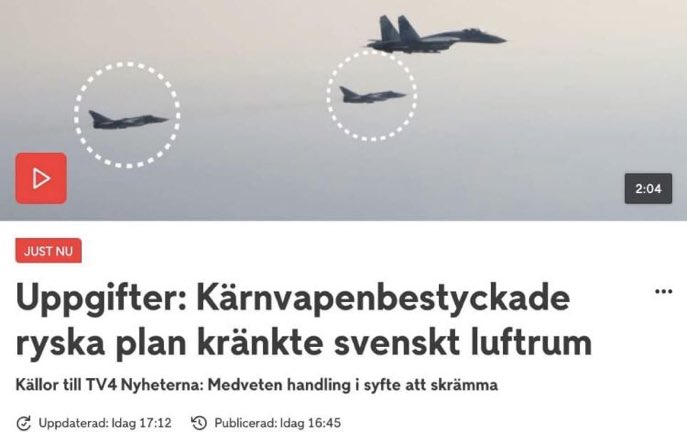 スウェーデンのTV局、TV4は数週間前にスウェーデンを領空侵犯したロシアの戦闘機4機のうち2機が核兵器を搭載していたことを明らかにした。スウェーデン人は激怒している。