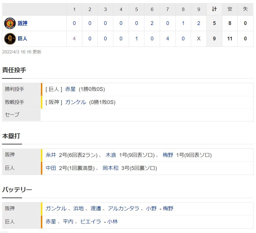巨人9ー5阪神 試合結果 東京ドーム 2022/4/2