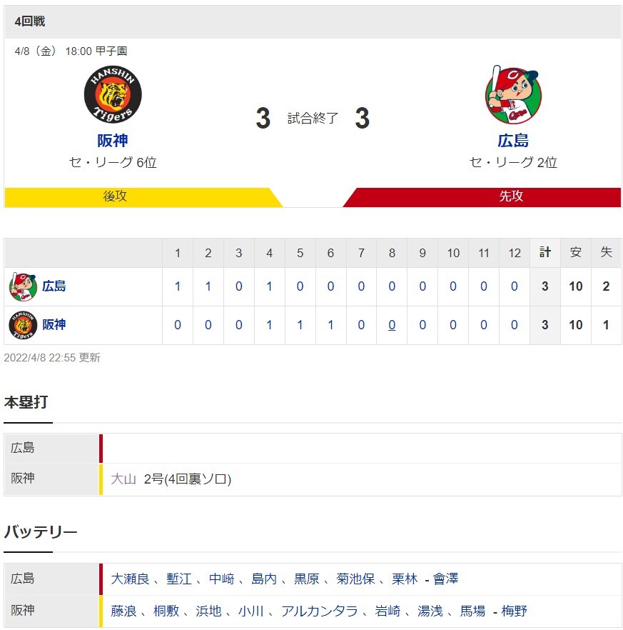 阪神3ー3広島 試合結果 甲子園球場 2022/4/8