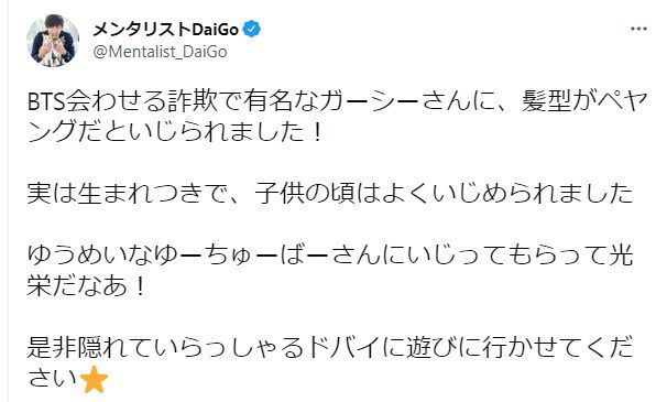 DaiGoはツイッターに「BTS会わせる詐欺で有名なガーシーさんに、髪型がペヤングだといじられました!」と批判たっぷりに報告。「実は生まれつきで、子供のころはよくいじめられました」とコンプレックスの1つであったことを明かして「ゆうめいなゆーちゅーばーさんにいじってもらって光栄だなあ!是非隠れていらっしゃるドバイに遊びに行かせてください」と、皮肉たっぷりに怒りをつづった。