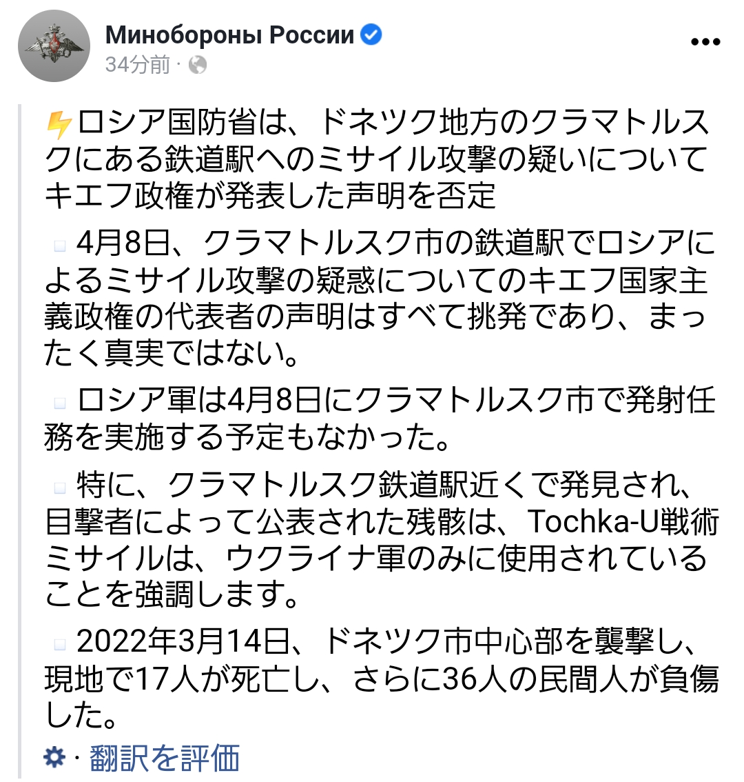 ロシア国防省「ウクライナの駅をミサイル爆撃した!」→「我々は駅に爆撃はしていない。ミサイルの残骸はウクライナ軍のものだ」