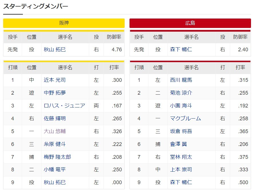 阪神ー広島 スタメン 甲子園球場 2022/4/9