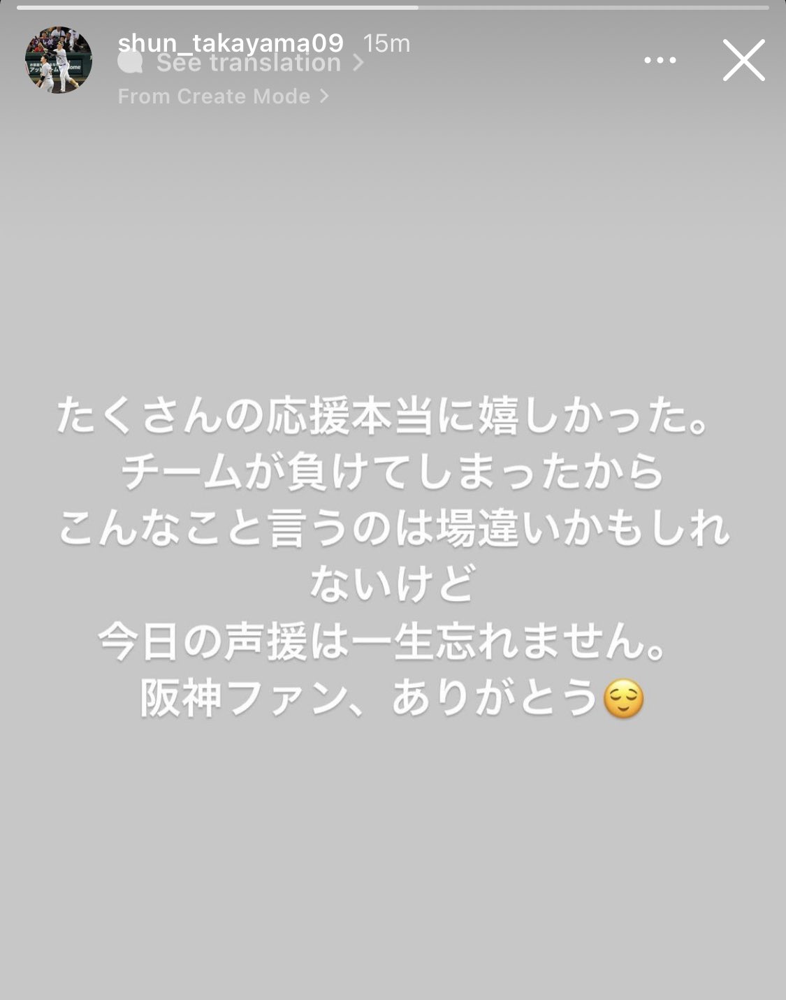 【阪神】高山「阪神ファンのみんな、声出して応援してくれてありがとう!嬉しかった!」