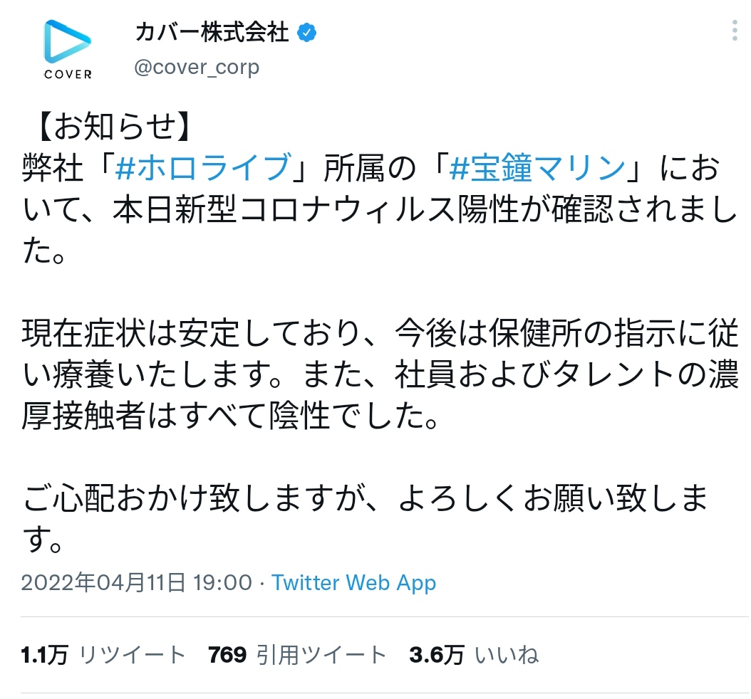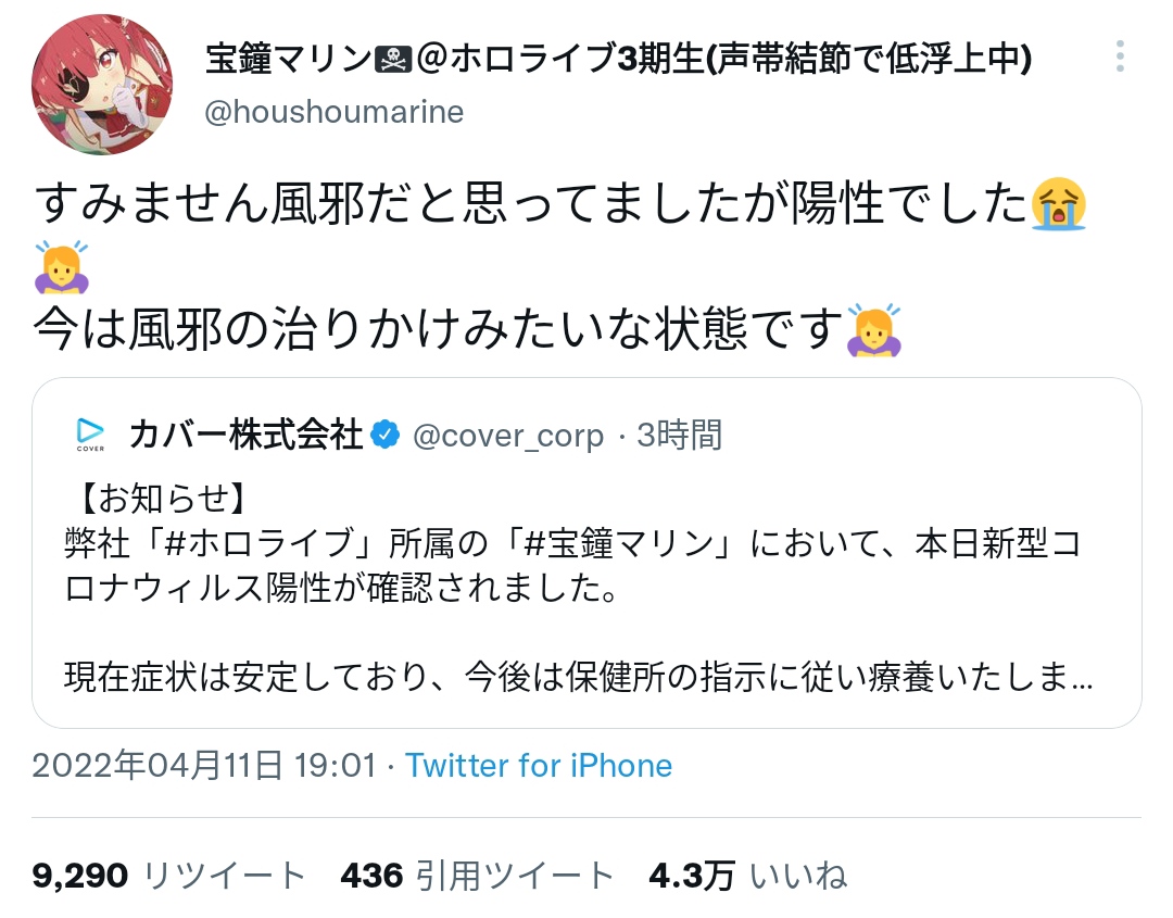 弊社「#ホロライブ」所属の「#宝鐘マリン」において、本日新型コロナウィルス陽性が確認されました。