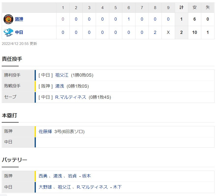 中日2ー1阪神 試合結果 バンテリンドーム 2022/4/12