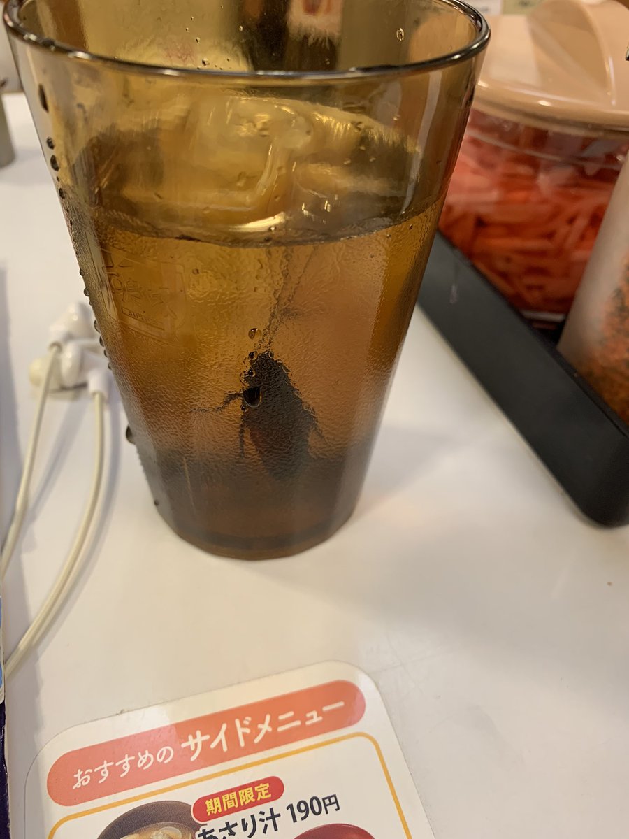 投稿者によると、この日にすき家を訪れ、キムチ牛丼を頼むと、店員がこのコップを持ってきた。ゴキブリに気づいて飲まず、店員に伝えて、交換してもらった。