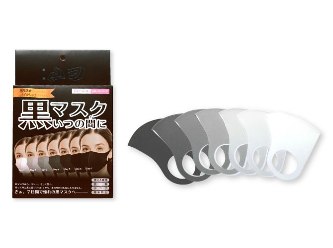 商品名は「黒マスクいつの間に」。初日は白マスク、翌日は薄いグレー、だんだん濃くなっていき、最終日は黒、と日ごとに違う色のマスクを着けられる7枚セットだ。