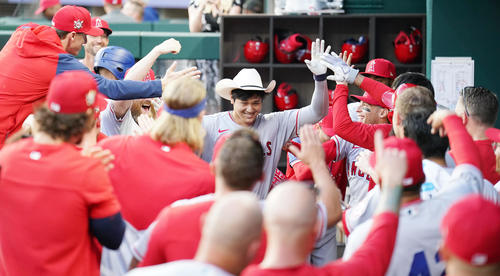 1打席目には待望の一発が出た。初回先頭で初球を捉えた今季1号。自身初の「プレーボール弾」を右翼席に運んだ。メジャー初先発だったレンジャーズ右腕・ブッシュの初球、高めの95・9マイル(約154・3キロ)直球を振り抜いた。開幕から8試合目、31打席目での1号はメジャー移籍5年目で最も遅い。ようやく出た一打に、テキサス州での試合とあって、ダイヤモンドを1周してベンチに戻ると、カウボーイハットをかぶせられて祝福された。2番手右腕・アブレイユと対戦した3回1*2打席目も左翼へ大飛球。2打席連続弾かと思われたが、ファウル判定で、見逃し三振に倒れたが、3打席目に2号を放った。