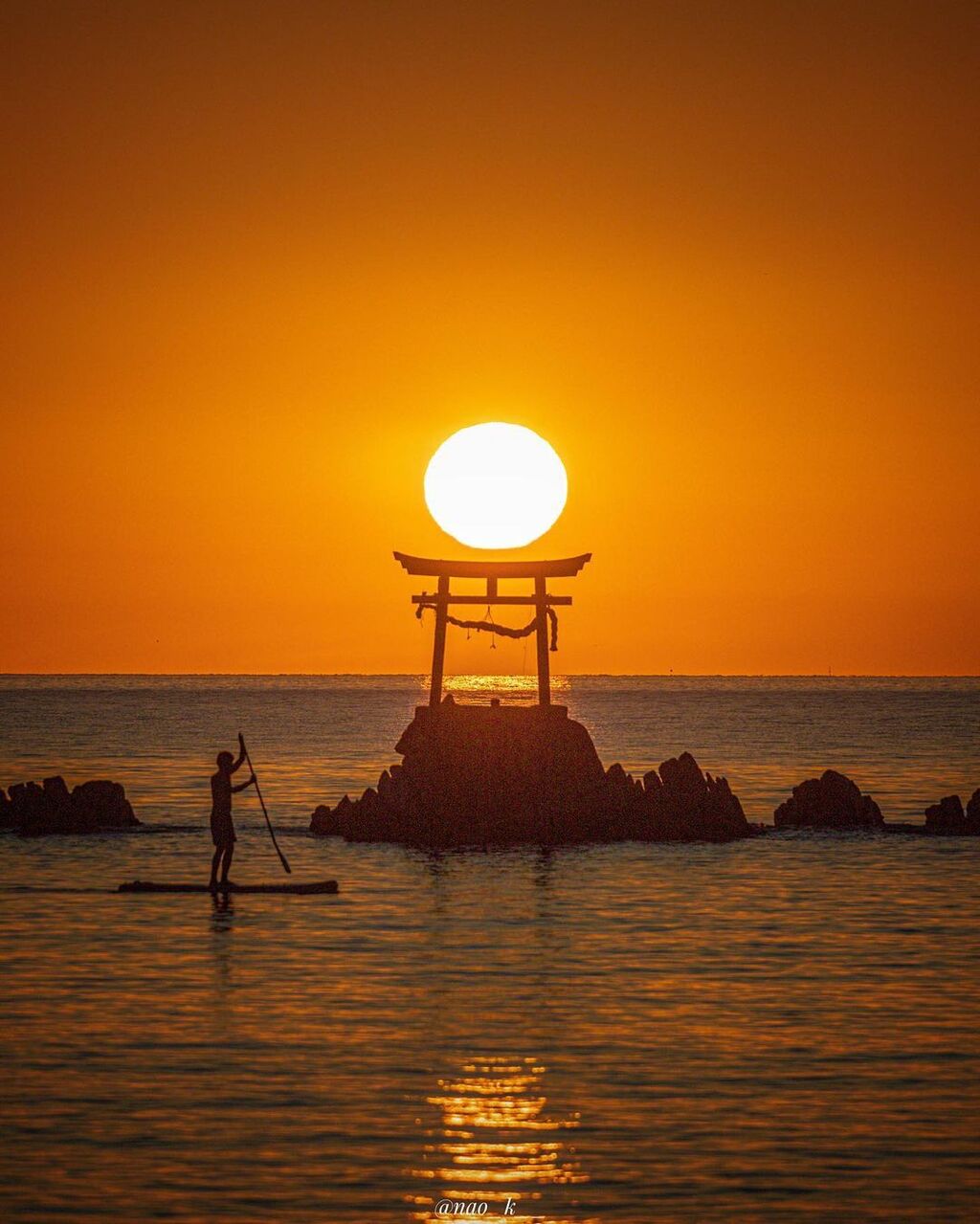 海岸の中央には「八幡奈多宮」があり、沖合に浮かぶ鳥居と朝日の美しい競演を見ることができます。