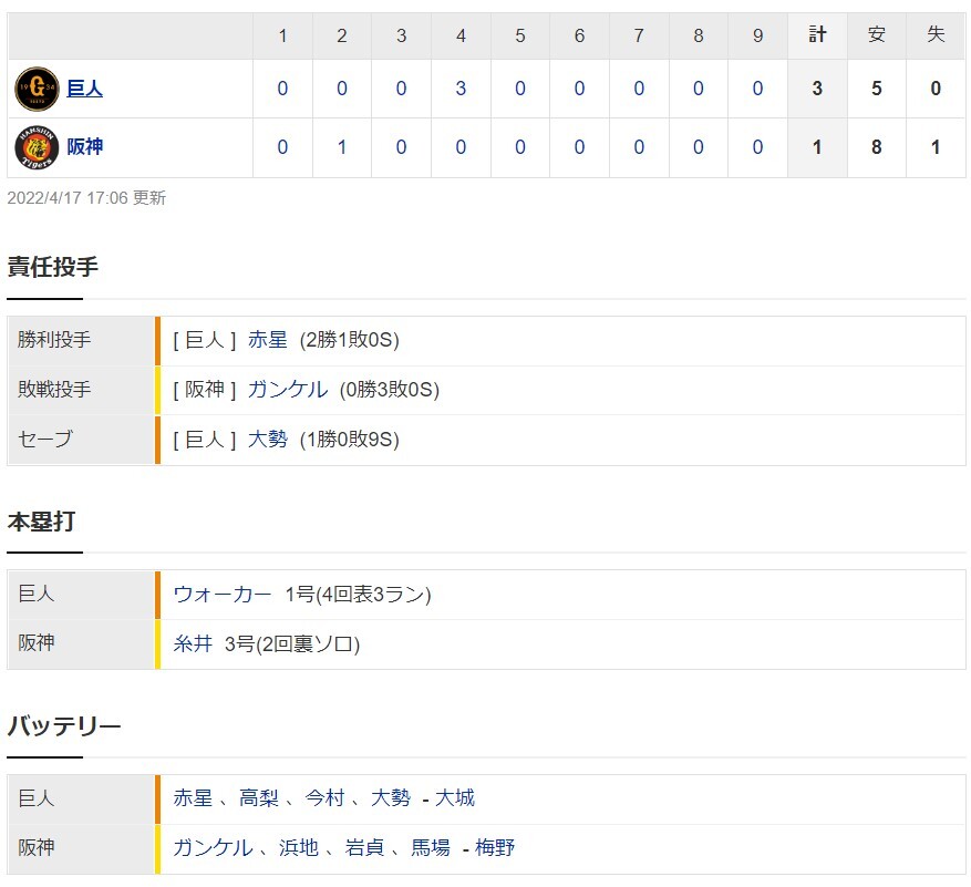 阪神1ー3巨人 試合結果 甲子園球場 2022/4/17