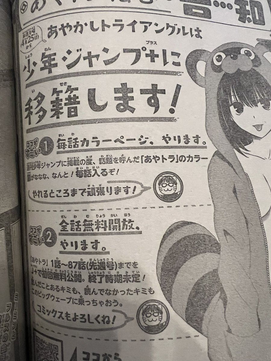 【悲報❓】矢吹先生の「あやかしトライアングル」、ジャンプ+へ移籍してしまう…