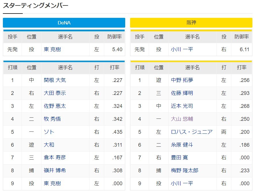 DeNAー阪神 スタメン 横浜スタジアム 2022/4/20