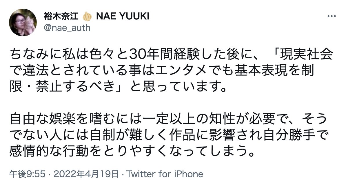 裕木奈江氏(@nae_auth)の発言は、言論統制主義的であることが大きな問題だけど、特に後段は非常に致命的で、「自由な娯楽を嗜むには一定以上の知性が必要」として、