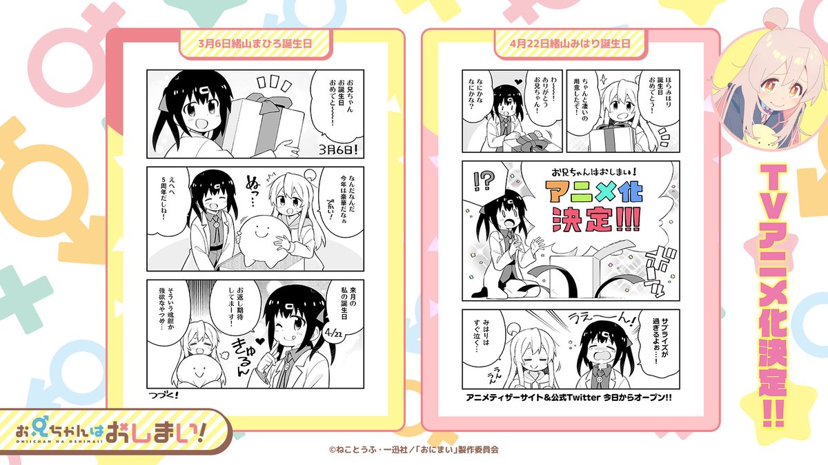 漫画『お兄ちゃんはおしまい!』がテレビアニメ化されることが決定した。あわせてPVやキャスト情報が公開され、緒山まひろ役を高野麻里佳、緒山みはり役を石原夏織が担当する。
