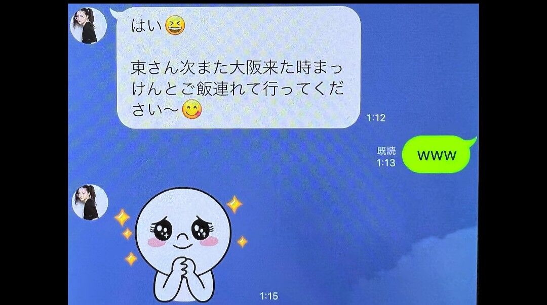 これには東谷氏も「まっけんに気つかうやん笑笑」と返信、村瀬さんも「東谷さんは恩人です~。今度、ご飯行きましょう~^_^」と、返していました。