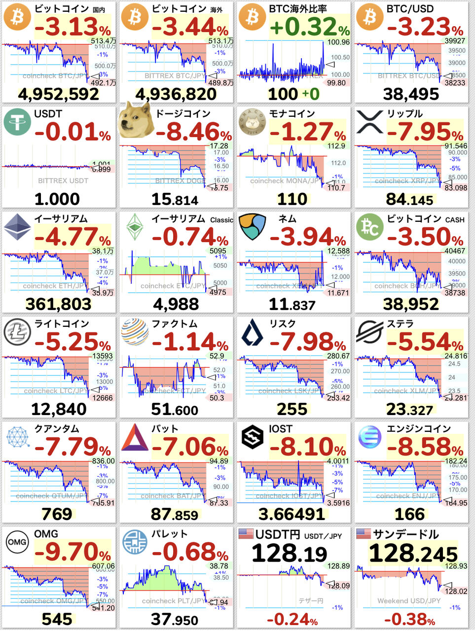 【速報】ビットコイン急落、仮想通貨全面安・・・