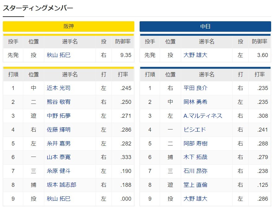阪神ー中日 スタメン 甲子園球場 2022/4/28