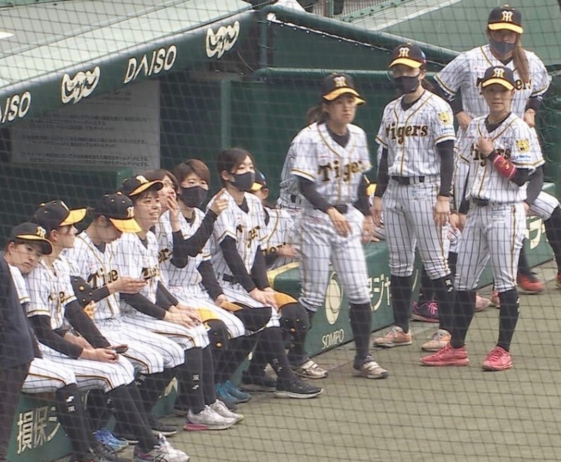 午前9時前にタイガースWomenはユニホーム姿でグラウンドに登場し、ベンチ前に集合した。