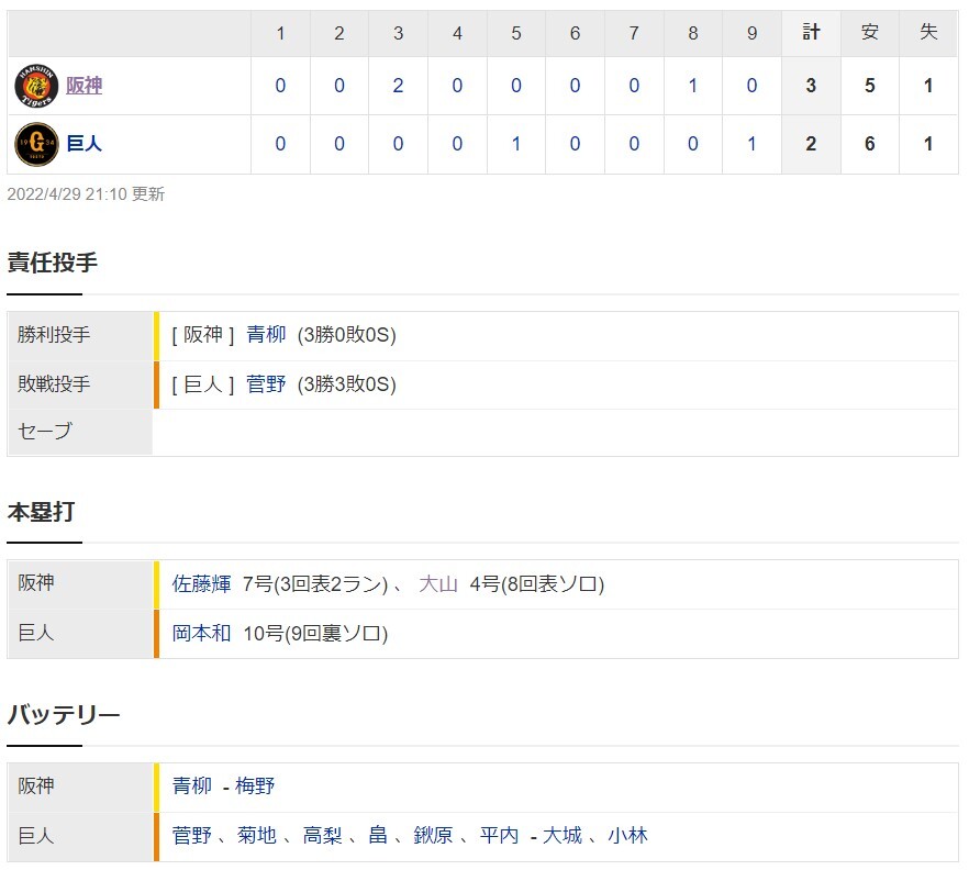 巨人2ー3阪神 試合結果 東京ドーム 2022/4/29