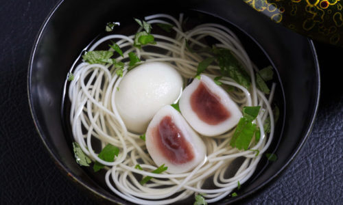 もち米をこねて鶏の卵の形に丸め、中に小豆のあんを入れ、それを昆布としいたけのだしでとった汁で食べるもち料理。