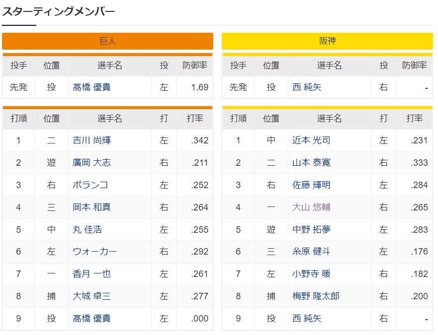 巨人ー阪神 スタメン 東京ドーム 2022/5/1