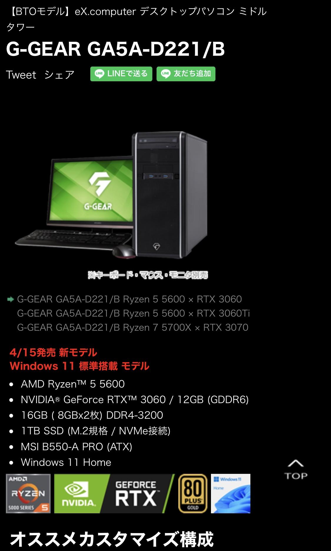 これをBTOでRyzen7 5700とRTX3070にカスタムして¥219600