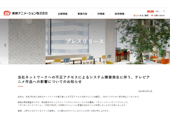 【不正アクセス】東映アニメ、調査結果を公表–業務ソフト配布元が改ざん。 同社では従業員の対応体制の強化をなどを行う。