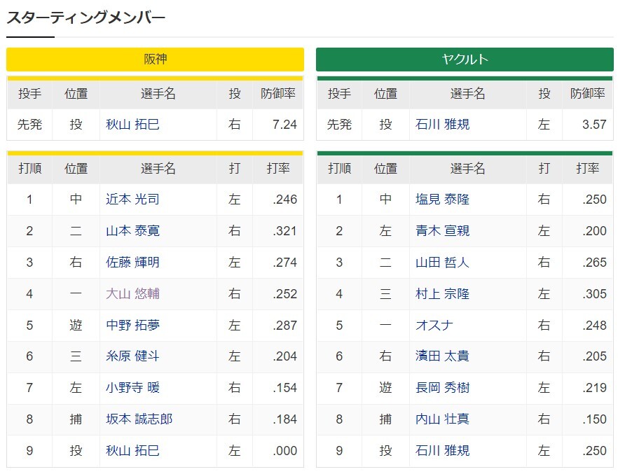 阪神ーヤクルト スタメン 甲子園球場 2022/5/4