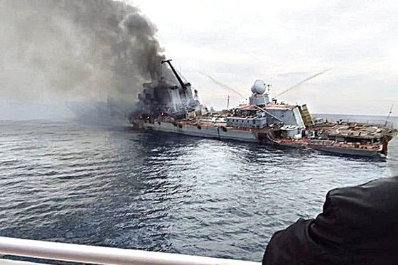 ロシア黒海艦隊の旗艦である巡洋艦「モスクワ」が13日にウクライナ南部のオデーサ(オデッサ)でウクライナ軍が撃った対艦ミサイル「ネプチューン」2発を受け沈没している。2010年に再就役したモスクワはミサイル巡洋艦で価格は7億5000万ドルだ。写真はツイッターで公開されたモスクワの沈没前の姿。極めて信憑性はあるが真偽が確認されたものではない。依然としてロシアは事故だと主張している。