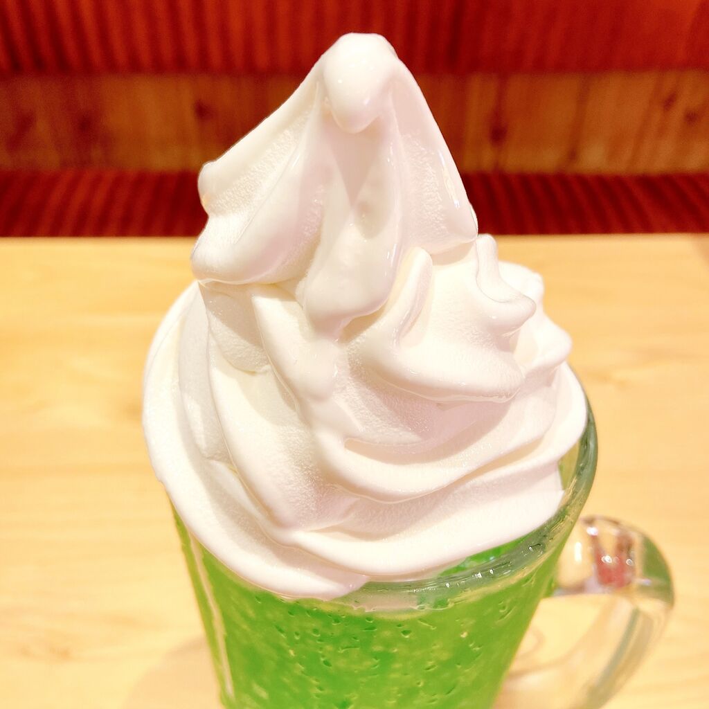 メロンソーダの上に、ソフトクリームがこれでもかとのせられています。