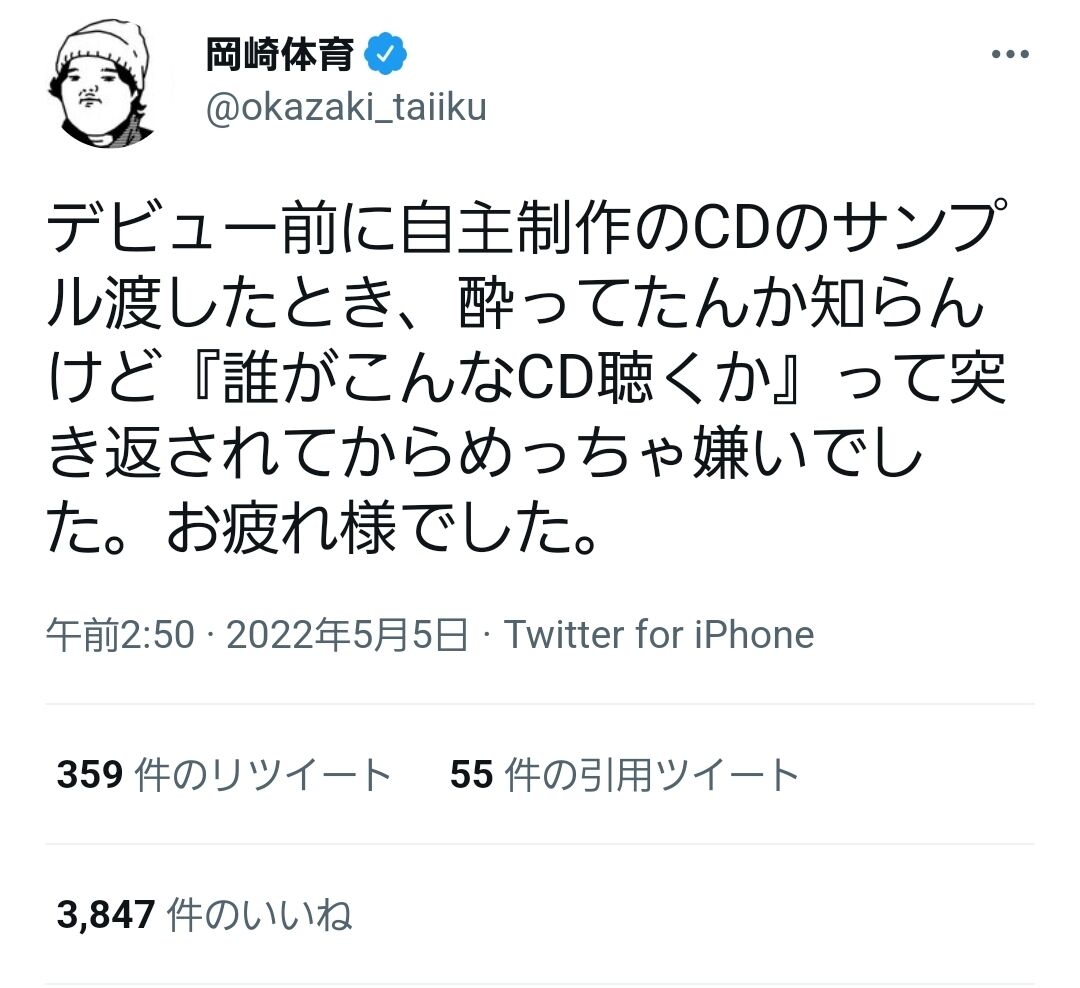 【悲報】岡崎体育さん「昔CD渡したら誰がこんなもん聴くかと突き返されたときから嫌いでした」