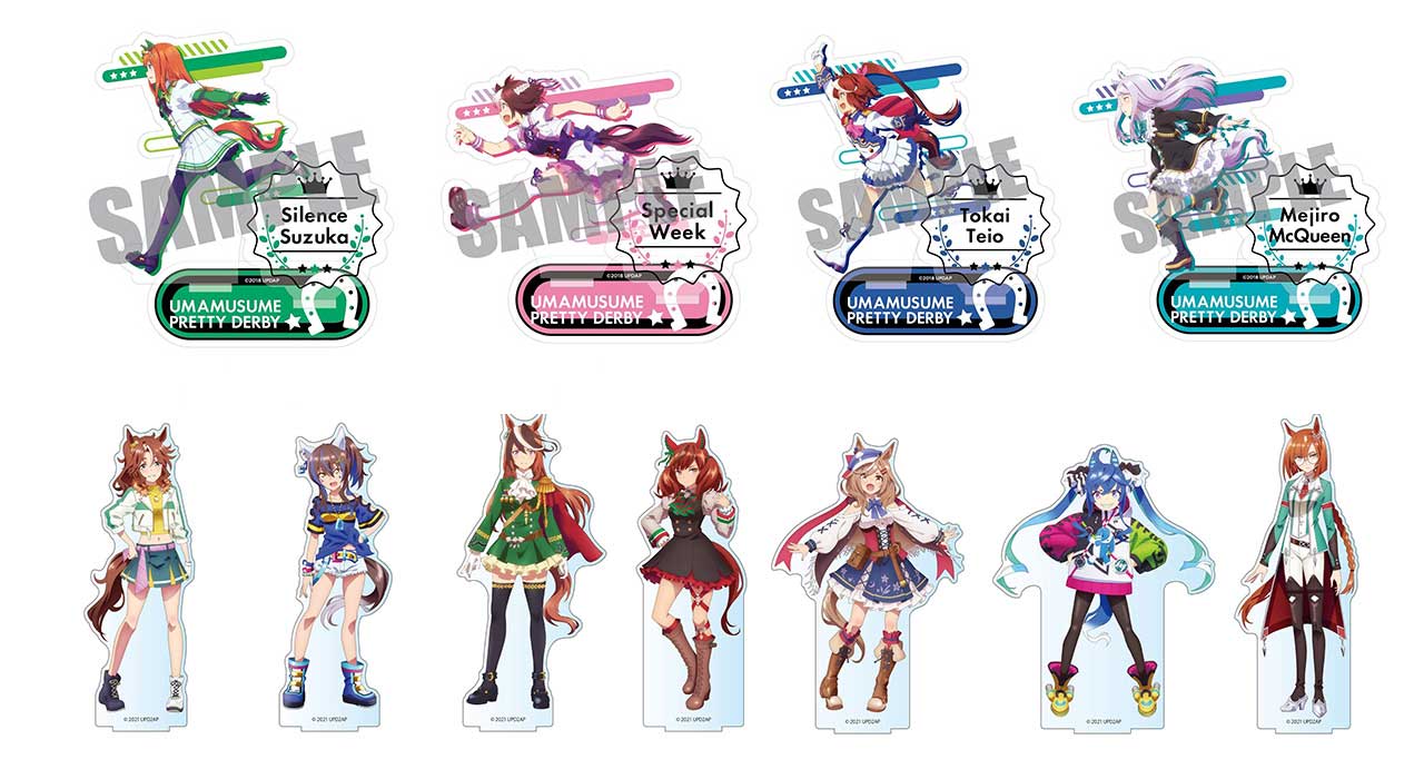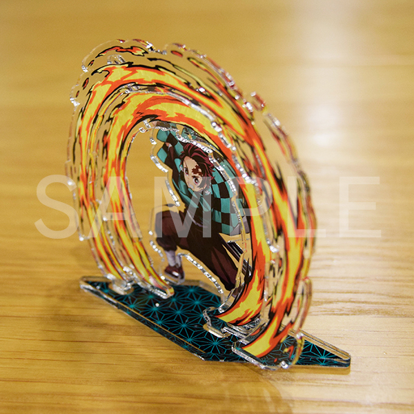 アクリルフィギュア 透明なアクリル樹脂製の板にキャラクターのイラストや芸能人の写真を印刷したもの。立てて飾れるように成形された製品は「アクリルスタンド」と呼ばれ、同様の製品であるアクリルキーホルダーとともに「アクスタ」「アク