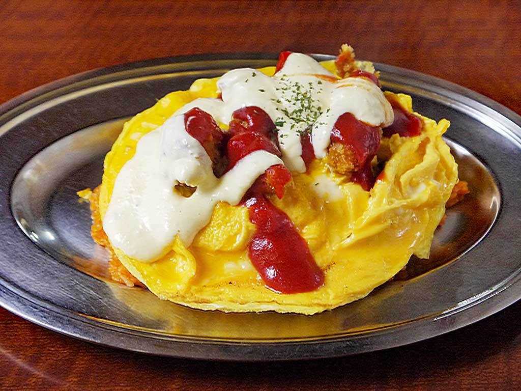 オムライスの上に白身魚やエビなどのフライと、たっぷりのタルタルソースをプラスしたものが一般的です。