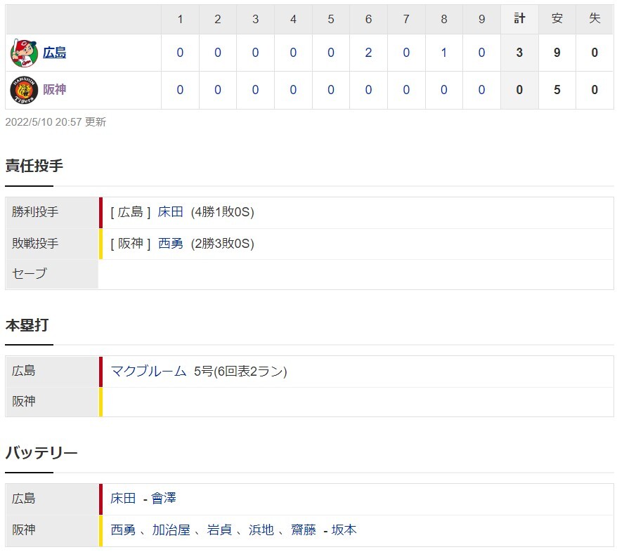 阪神0ー3広島 試合結果 甲子園球場 2022/5/10