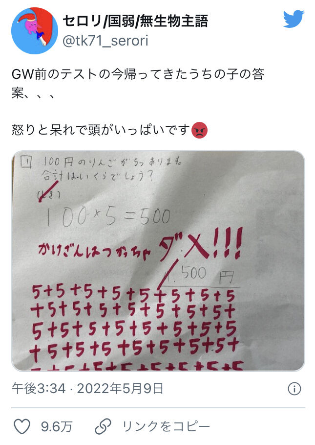 【超画像】「100円のりんごが5つあります 合計はいくらになるでしょう」←小学生のクソガキが解いた結果WWWWWWWWWWWWWWWWWWWWWWWWWWWWWW