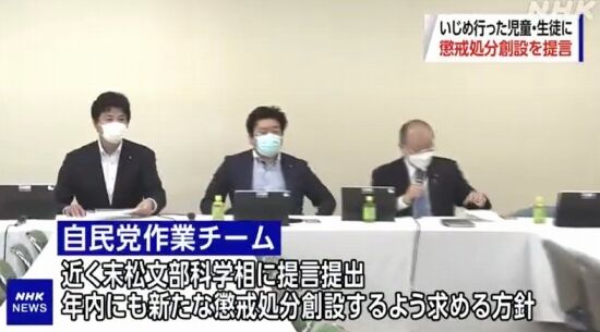| “いじめを行った児童生徒に懲戒処分 創設を” 自民作業チーム – nhk.or.jp “いじめを行った児童生徒に懲戒処分 創設を” 自民作業チーム nhk.or.jp (出典:nhk.or.jp) |