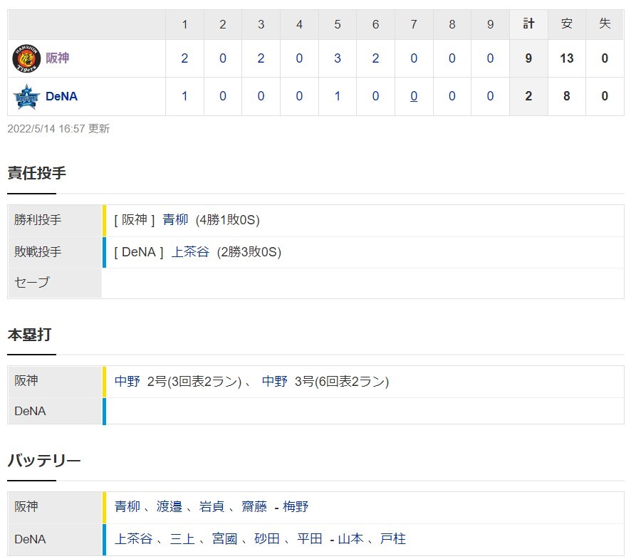 DeNA2ー9阪神 試合結果 横浜スタジアム 2022/5/14