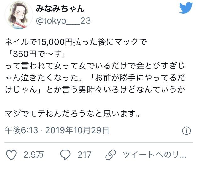 【画像】Twitter女子「ネイルで1.5万円払ってマック行ったら350円で泣いた。理解できない男は非モテ」→2万いいねwwwwwwww