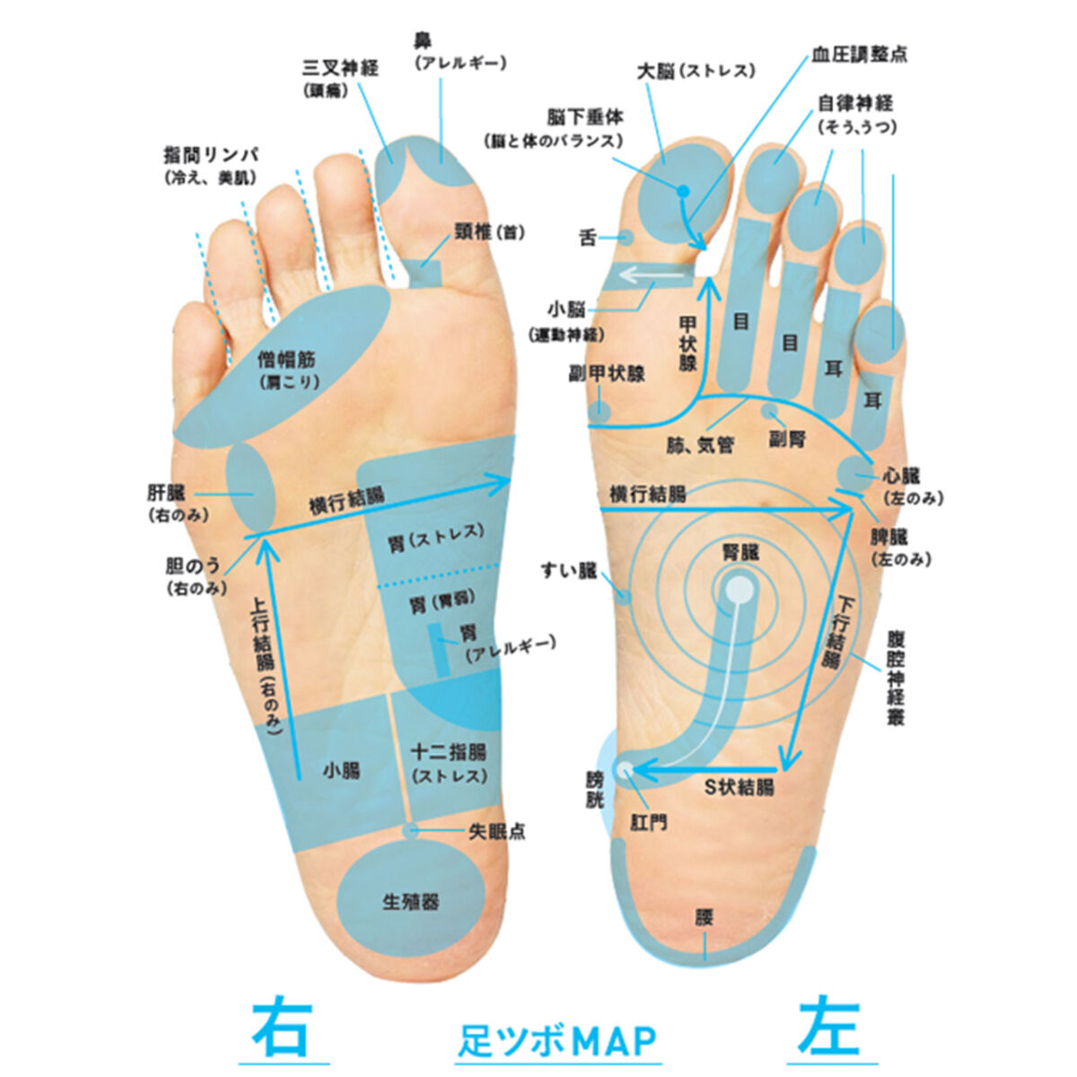 足裏には約60~70もの反射区(つぼ)があり、体のどこかが不調になると足裏のつぼが硬くなったり、カサカサしたり、押すと痛みを感じたりします。