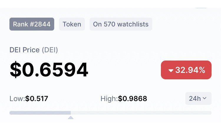BREAKING: $DEI stablecoin has lost its peg to the dollar and is down 33% in the past 24h. https://t.co/TQHG6erjod