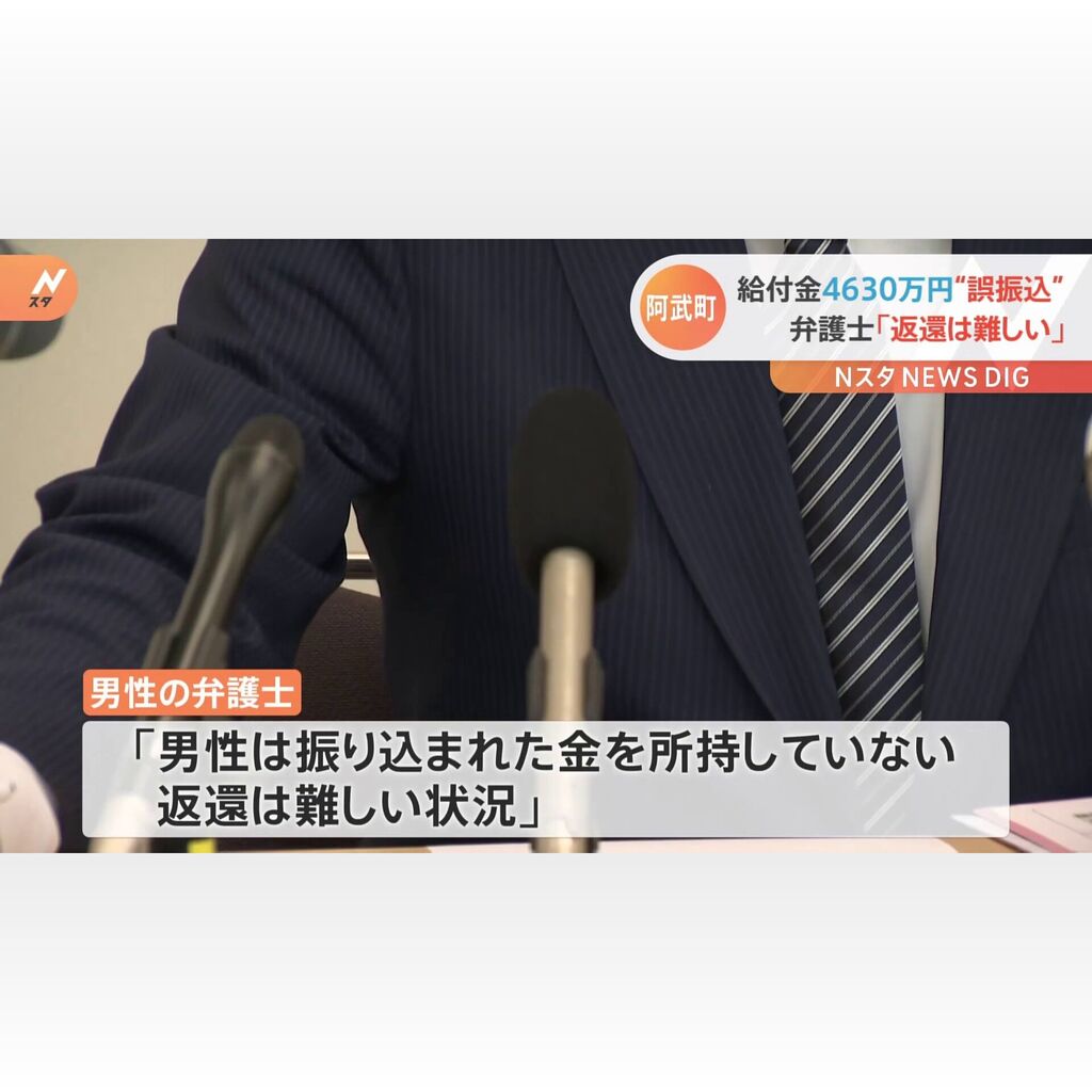 「手元にない」返せない理由…“誤送金”4630万円 …弁護士:「現実的な問題として、返還が難しい状態となっております」 山口県阿武町で、新型コロナ関連の給付金4630万円が誤って24歳の男性に送金され、… (出典:テレビ朝日系(ANN)) |