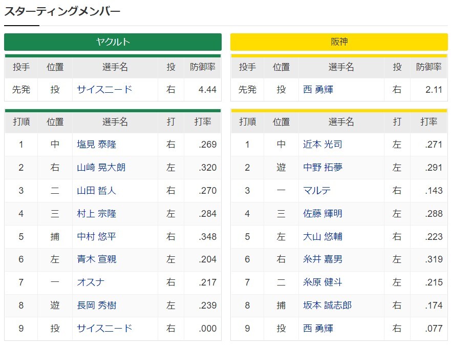 ヤクルトー阪神 スタメン 神宮球場 2022/5/17