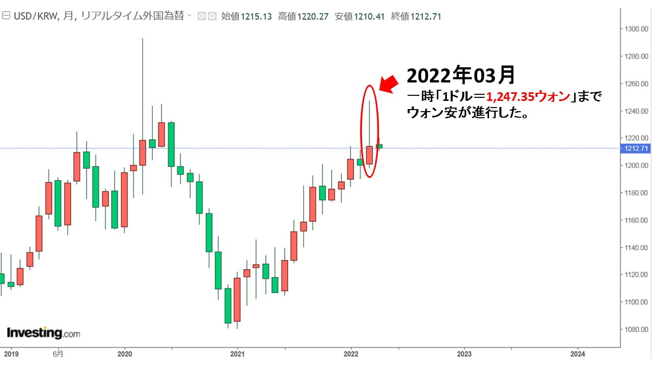上掲は、ローソク足1本が1カ月の値動きを示す「月足」ですが、03月は一時「1ドル=1,247.35ウォン」までウォン安が進行しました。