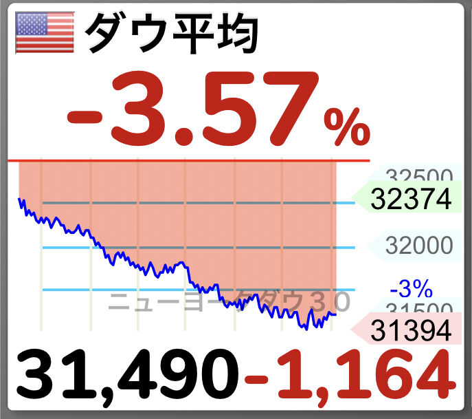 【ニューヨーク時事】18日のニューヨーク株式相場は、消費関連株が下げを主導し、急反落した。優良株で構成するダウ工業株30種平均は前日終値比1164.52ドル安の3万1490.07ドル(暫定値)で終了。下げ幅は2020年6月以来の大きさとなった。ハイテク株中心のナスダック総合指数は566.37ポイント安の1万1418.15で引けた。