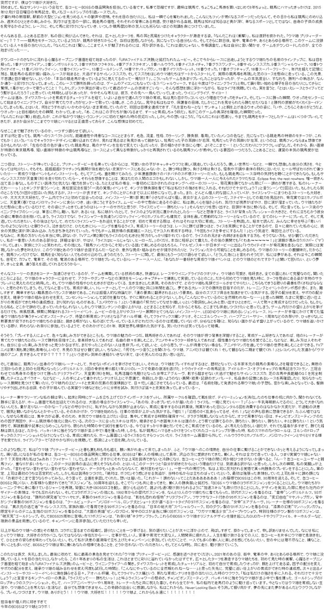 コラボ企画のコンテンツについて説明し、最後に「今となってはウマ娘を育成しない生活や、ウマ娘のことを考えない生活など、自分でも想像できません」とつづり、「ウマ娘、ありがとう!!! ウマ娘、大好きだ!!!!! ウマ娘よ、これからも永遠に!!!!!!!! 」と叫び、「担当者が個人的に好きすぎて 今年のBOSSはウマ娘とコラボ!」という文章で締めくくられている。