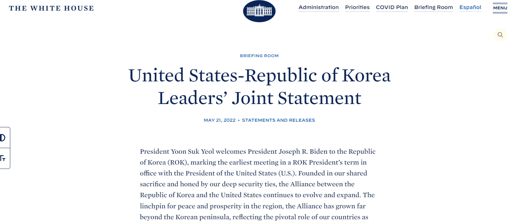 ⇒参照・引用元:『White House』公式サイト「United States-Republic of Korea Leaders’ Joint Statement」