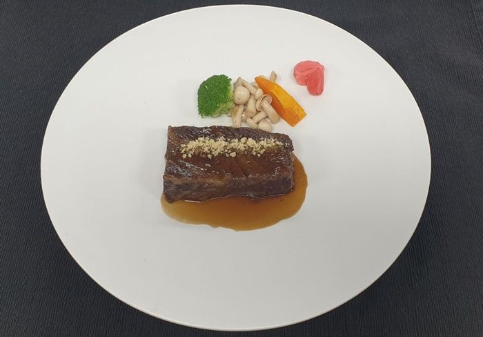 メイン料理には、八道(パルド)で採れた旬のナムルをコチュジャンソースに混じぇ混じぇして食べる山菜ビビンバ(ピビムパプ)と豆腐団子汁(トゥブ ワンヂャタン)で、米国産牛肉を使った牛カルビを真空調理法で醤油ダレで熟成させて焼いたものがテーブルに並んだ。