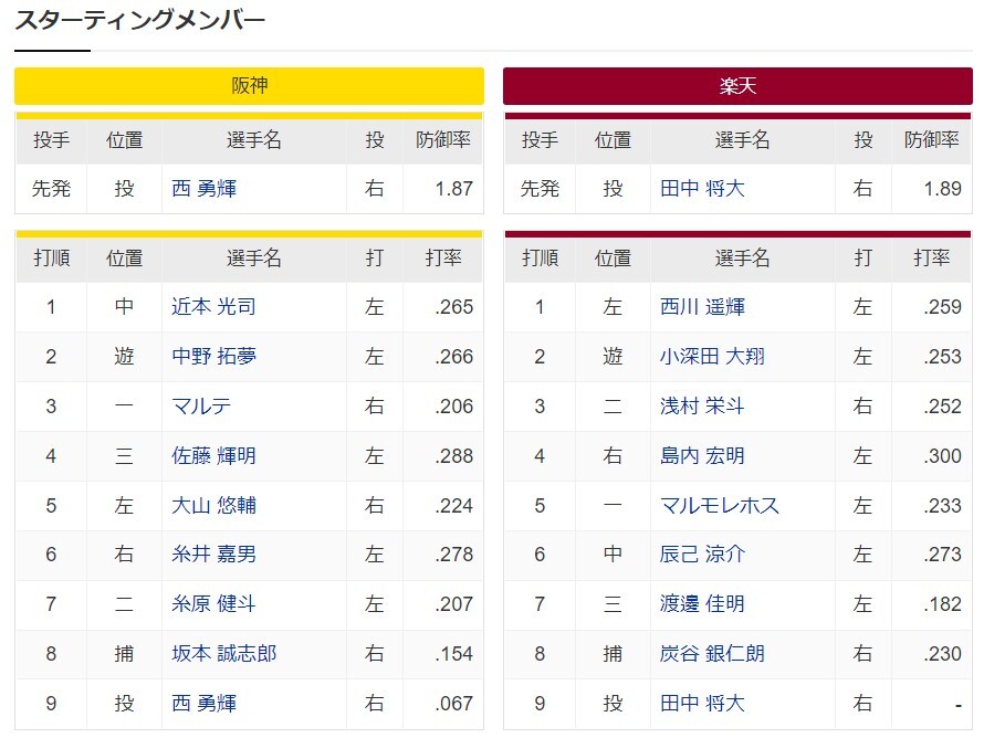 【交流戦】阪神ー楽天 スタメン 甲子園球場 2022/5/24