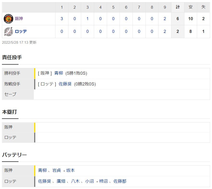 【交流戦】ロッテ2ー6阪神 試合結果 ZOZOマリンスタジアム 2022/5/28