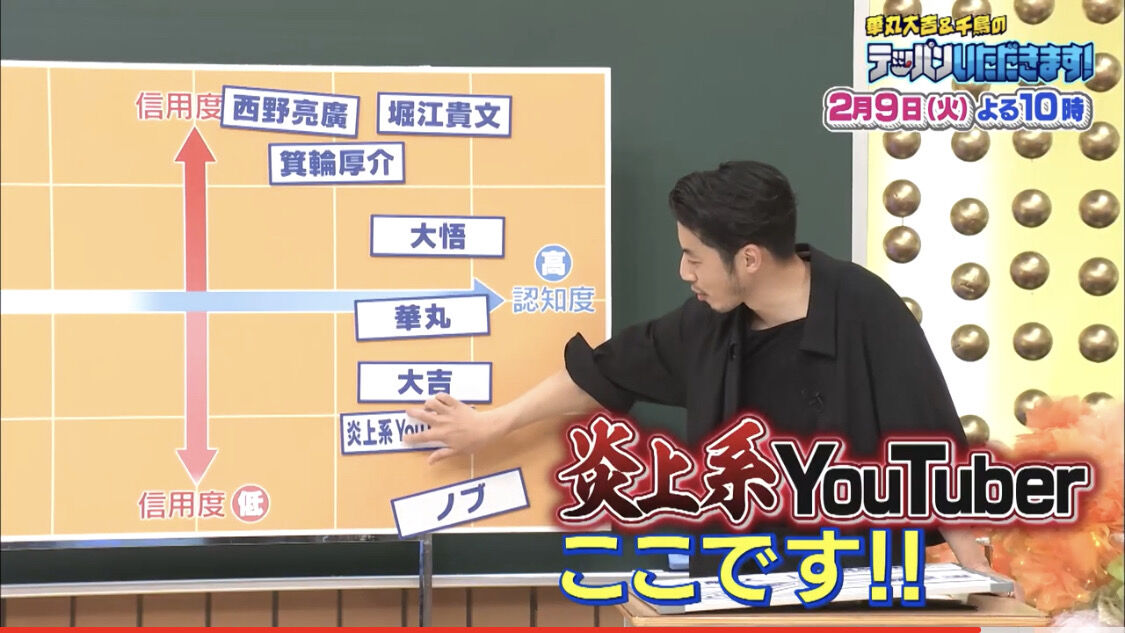 今回の放送で西野はレギュラー出演者を前に、「絶滅危惧種テレビタレントの救い方」をレクチャー。そこで強調されたのは、認知タレントと人気タレントの違いだ。認知タレントはデパートなどの無料ライブで人を集めるが、お金を払う単独ライブには人が集まらない。知名度がありながら人気のない芸能人YouTuberは認知タレントとなる。